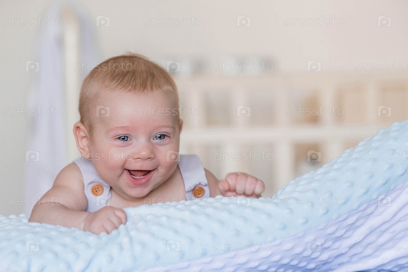 Очаровательный мальчик в яркой спальне. Новорожденный ребенок лежит на кровати. Ребенок 4 месяцев смотрит и улыбается в камеру. Постельные принадлежности для детей. Семья, беременность и роды