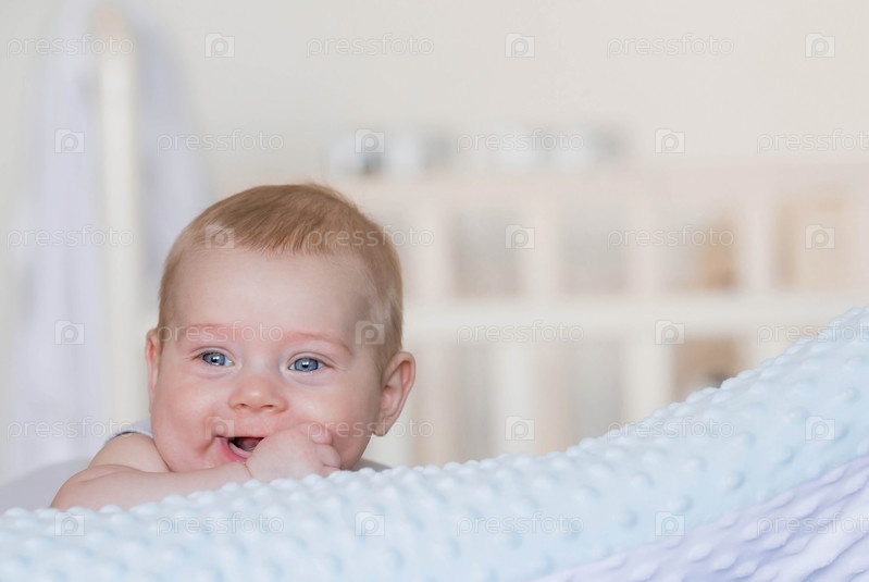 Очаровательный мальчик в яркой спальне. Новорожденный ребенок лежит на кровати. Ребенок 4 месяцев смотрит и улыбается в камеру. Постельные принадлежности для детей. Семья, беременность и роды