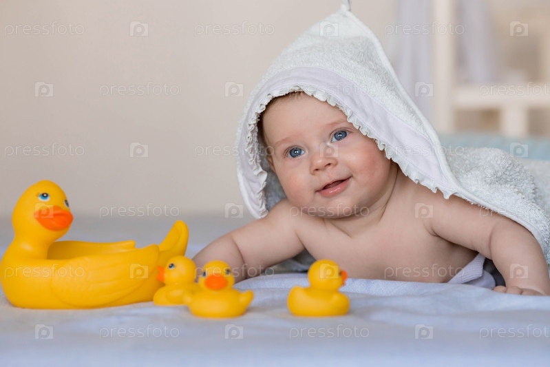 Очаровательный новорожденный ребенок лежит на кровати с резиновыми уточками после купания. 4-месячный ребенок с полотенцем на голове смотрит в камеру и улыбается. Купание и гигиена ребенка