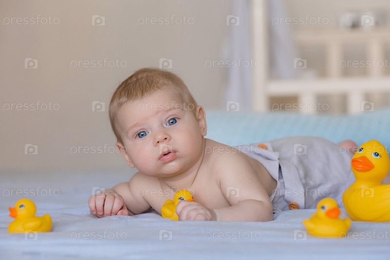 Очаровательный новорожденный ребенок лежит на кровати с резиновыми уточками после купания. Ребенок 4 месяцев смотрит в камеру. Купание и гигиена ребенка