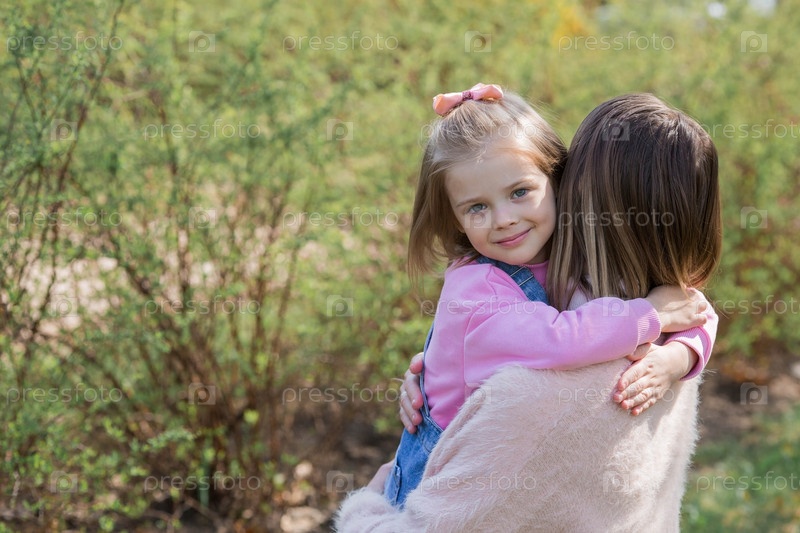 Красивая маленькая девочка в розовой одежде гуляет со своей мамой в парке на свежем воздухе. Ребенок обнимает свою мать. Семья, любовь, дети, материнство