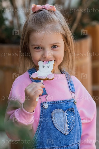 Красивая симпатичная девушка в розовой одежде с бантиком на голове ест пряники в виде единорога. Детство. Сладости