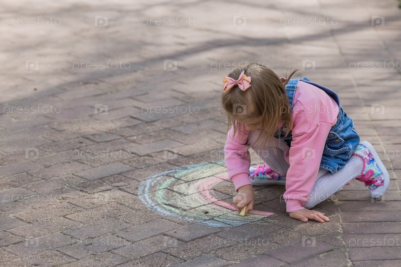 Счастливая девушка в розовой одежде рисует радугу мелом на асфальте на улице. Портрет маленькой девочки, рисующей радужным мелом в солнечный летний день. Творческое развитие детей