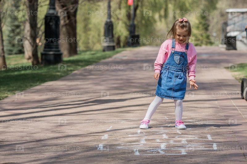Счастливая девушка в розовой одежде рисует классику мелом на асфальте на улице. Портрет маленькой девочки, играющей и прыгающей в классики в солнечный летний день. Творческое развитие детей