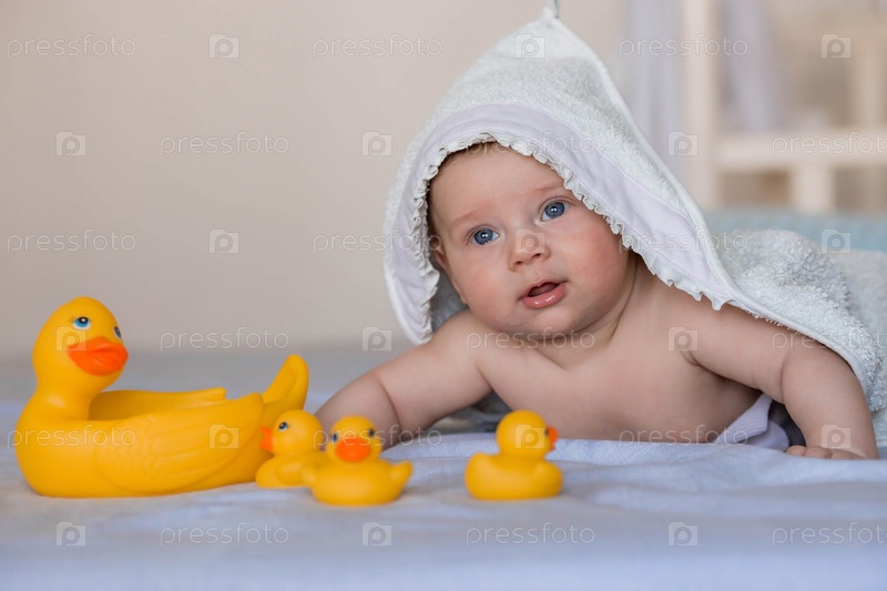 Очаровательный новорожденный ребенок лежит на кровати с резиновыми уточками после купания. 4-месячный ребенок с полотенцем на голове смотрит в камеру и улыбается. Купание и гигиена ребенка