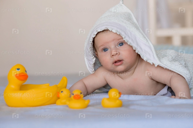 Очаровательный новорожденный ребенок лежит на кровати с резиновыми уточками после купания. 4-месячный ребенок с полотенцем на голове смотрит в камеру и улыбается. Купание и гигиена ребенка