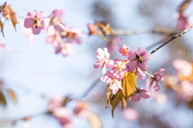Баннер. Вишневый цвет в Москве. Обои весна, природа. Японская вишня в саду. Цветущие почки на ветвях дерева в японском саду в дендрарии. Макро фотография. Россия, Царицыно