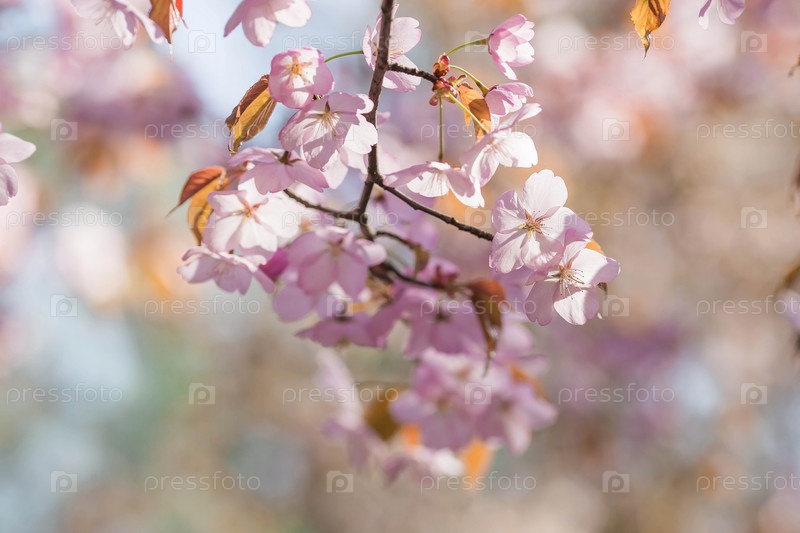 Баннер. Вишневый цвет в Москве. Обои весна, природа. Японская вишня в саду. Цветущие почки на ветвях дерева в японском саду в дендрарии. Макро фотография. Россия, Царицыно