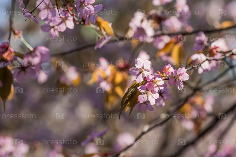 Баннер. Вишневый цвет в Москве. Обои весна, природа. Японская вишня в саду. Цветущие почки на ветвях дерева в японском саду в дендрарии. Макро фотография. Россия, Царицыно