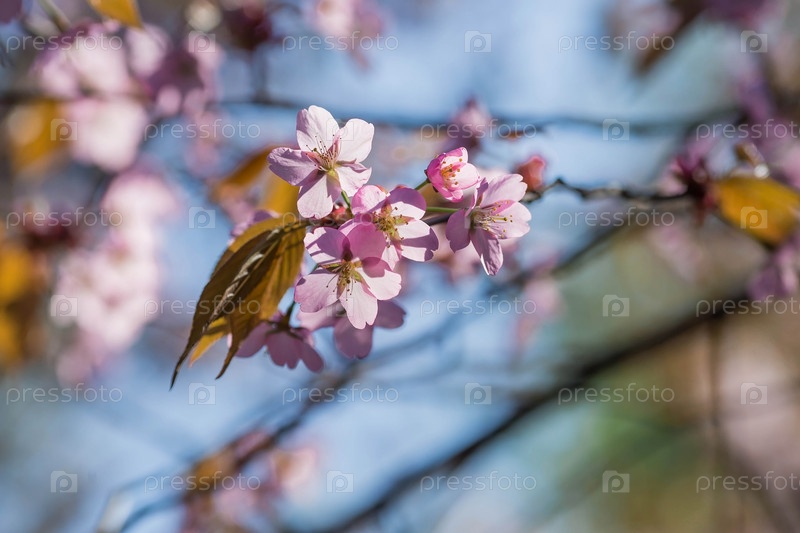Баннер. Вишневый цвет в Москве. Обои весна, природа. Японская вишня в саду. Цветущие почки на ветвях дерева в японском саду в дендрарии. Макро фотография. Россия, Царицыно
