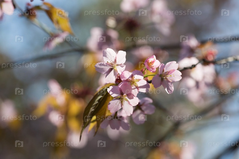 Баннер. Вишневый цвет в Москве. Обои весна, природа. Японская вишня в саду. Цветущие почки на ветвях дерева в японском саду в дендрарии. Макро фотография. Россия, Царицыно