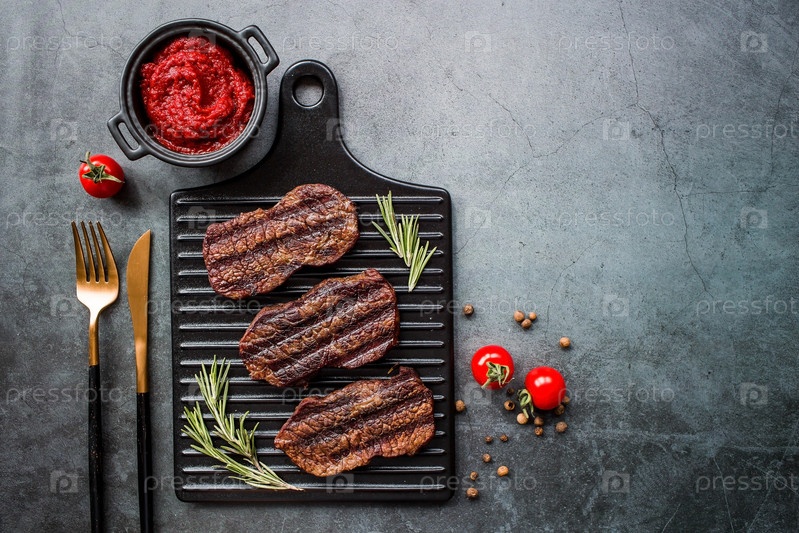Свежее мясо. Жареные стейки из говядины с розмарином, специями и томатной пастой на стильной доске. Плоский вид сверху