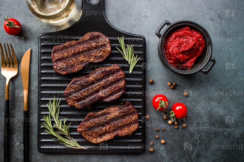 Свежее мясо. Жареные стейки из говядины с розмарином, специями и томатной пастой на стильной доске. Плоский вид сверху