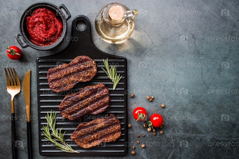 Свежее мясо. Жареные стейки из говядины с розмарином, специями и томатной пастой на стильной доске. Плоский вид сверху