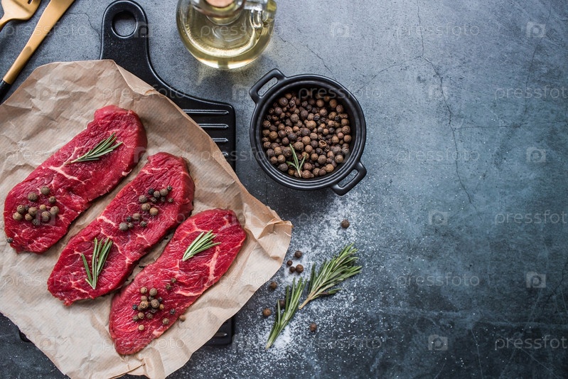 Свежее мясо. Стейки из сырой говядины с розмарином и специями на пергаментной бумаге на стильной доске. Плоский вид сверху