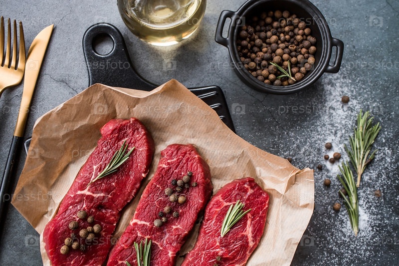 Свежее мясо. Стейки из сырой говядины с розмарином и специями на пергаментной бумаге на стильной доске. Плоский вид сверху