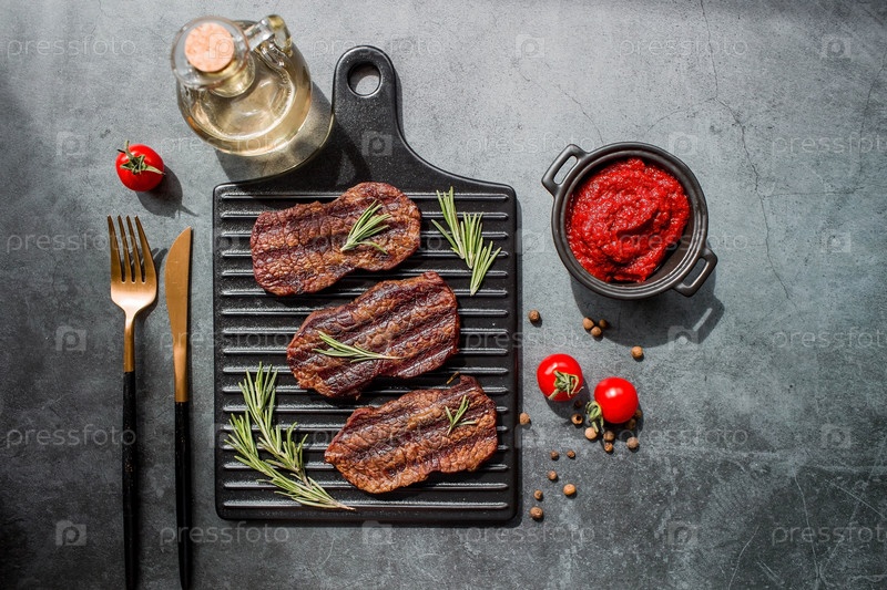 Свежее мясо. Жареные стейки из говядины с розмарином, специями и томатной пастой на стильной доске. Плоский вид сверху