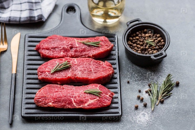 Свежее мясо. Стейки из сырой говядины с розмарином и специями на стильной доске. Плоский вид сверху