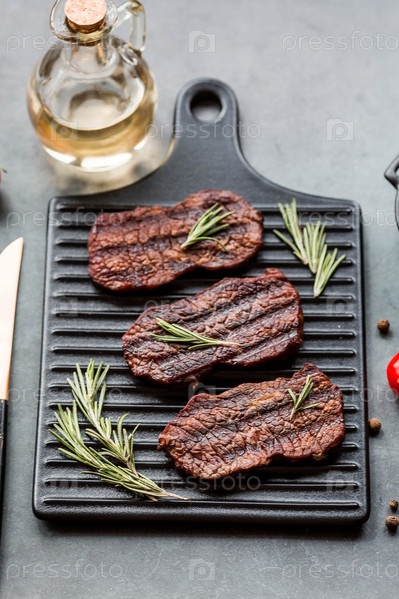 Свежее мясо. Жареные стейки из говядины с розмарином, специями и томатной пастой на стильной доске. Плоский вид сверху