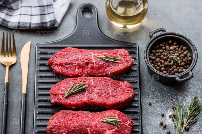 Свежее мясо. Стейки из сырой говядины с розмарином и специями на стильной доске. Плоский вид сверху