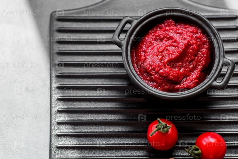Томатная паста в стильной черной кастрюле на керамической тарелке. Приготовление приправы, соуса. Консервирование овощей