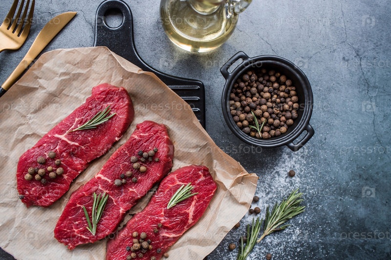 Свежее мясо. Стейки из сырой говядины с розмарином и специями на пергаментной бумаге на стильной доске. Плоский вид сверху