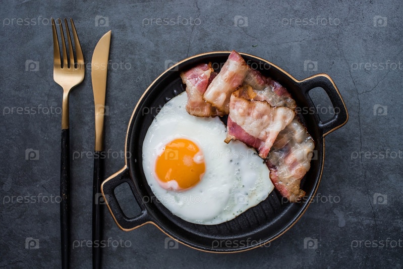 Яичница на стильной керамической тарелке с ручками с жареным беконом на темном фоне. Завтрак обед и ужин. Вкусная еда. Готовка