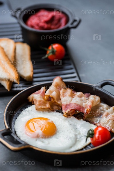 Жареные яйца на стильной керамической тарелке с ручками с жареным беконом, помидорами черри, томатной пастой и хлебными тостами на темном фоне. Завтрак обед и ужин. Вкусная еда