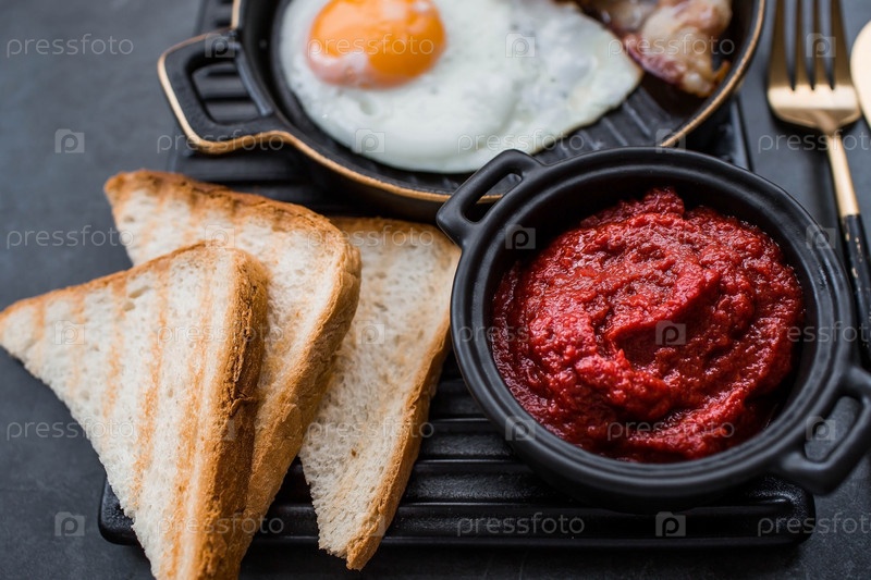 Жареные яйца на стильной керамической тарелке с ручками с жареным беконом, помидорами черри, томатной пастой и хлебными тостами на темном фоне. Завтрак обед и ужин. Вкусная еда