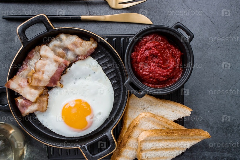 Жареные яйца на стильной керамической тарелке с ручками с жареным беконом, помидорами черри, томатной пастой и хлебными тостами на темном фоне. Завтрак обед и ужин. Вкусная еда