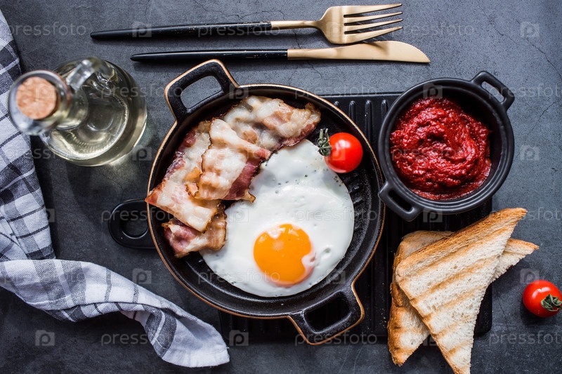 Жареные яйца на стильной керамической тарелке с ручками с жареным беконом, помидорами черри, томатной пастой и хлебными тостами на темном фоне. Завтрак обед и ужин. Вкусная еда