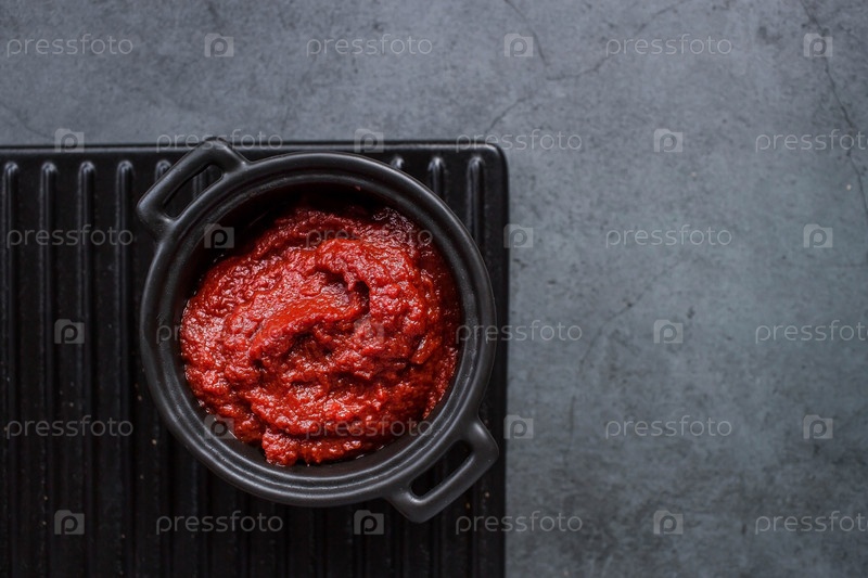 Томатная паста в стильной черной кастрюле на керамической тарелке. Приготовление приправы, соуса. Консервирование овощей