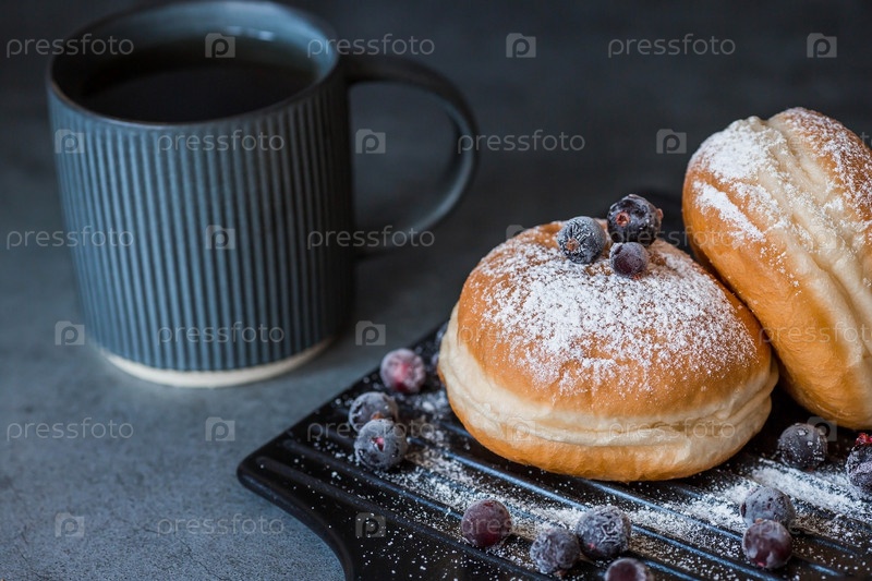 Вкусный десерт. Пончик с ягодной начинкой, свежие ягоды смородины, сахарная пудра и чашка черного кофе или чая на темном фоне. Сладости