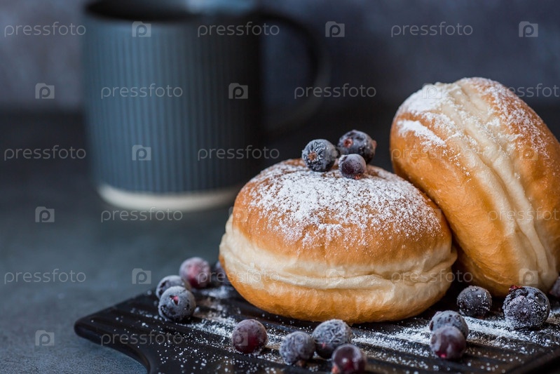 Вкусный десерт. Пончик с ягодной начинкой, свежие ягоды смородины, сахарная пудра и чашка черного кофе или чая на темном фоне. Сладости