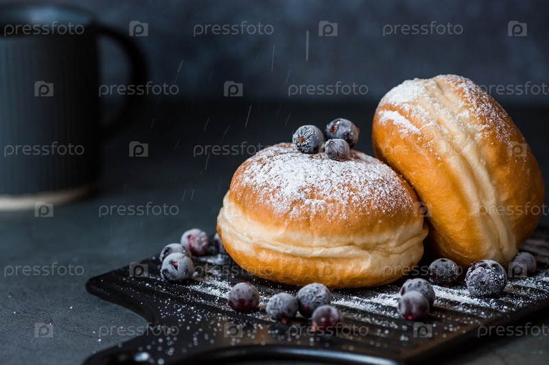 Вкусный десерт. Пончик с ягодной начинкой, свежие ягоды смородины, сахарная пудра и чашка черного кофе или чая на темном фоне. Сладости
