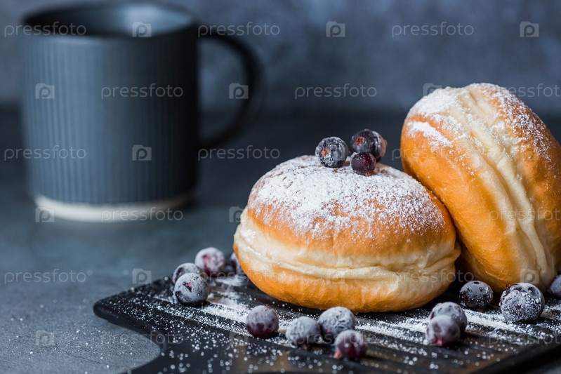 Вкусный десерт. Пончик с ягодной начинкой, свежие ягоды смородины, сахарная пудра и чашка черного кофе или чая на темном фоне. Сладости