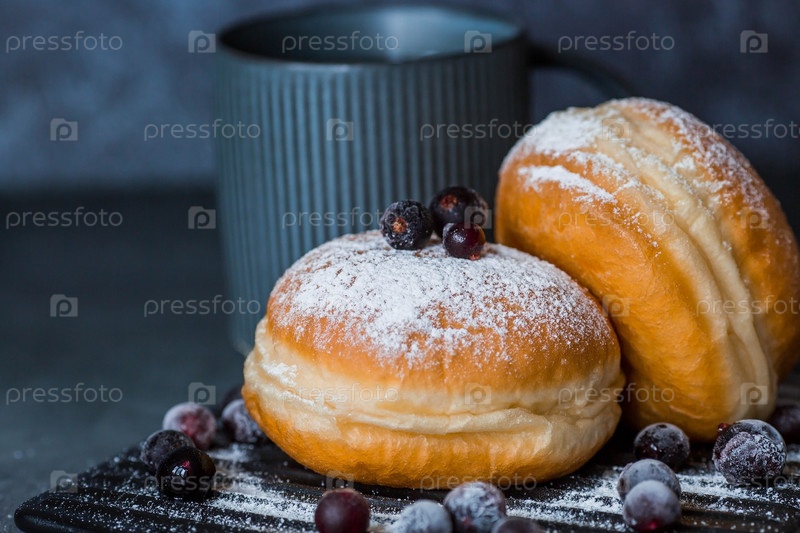 Вкусный десерт. Пончик с ягодной начинкой, свежие ягоды смородины, сахарная пудра и чашка черного кофе или чая на темном фоне. Сладости