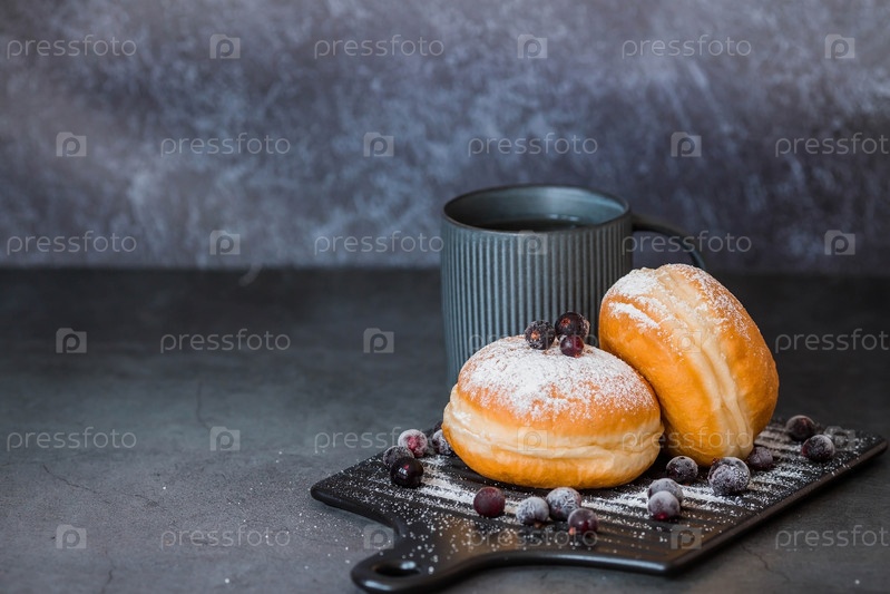 Вкусный десерт. Пончик с ягодной начинкой, свежие ягоды смородины, сахарная пудра и чашка черного кофе или чая на темном фоне. Сладости