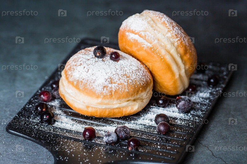 Вкусный десерт. Пончик с ягодной начинкой, свежими ягодами смородины и сахарной пудрой на стильной керамической тарелке на темном фоне. Сладости