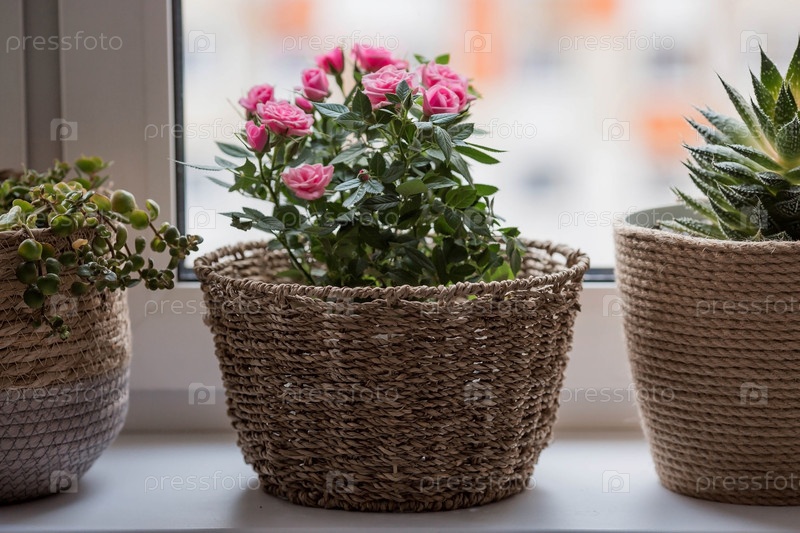 Уход за домашними растениями в домашних условиях. Домашние цветы. Розы на окне в стильных плетеных корзинах. Выращивание растений