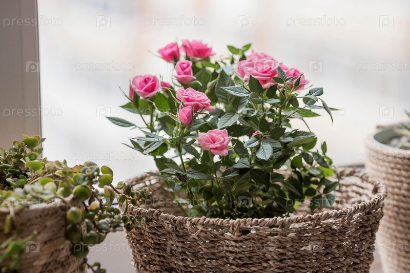 Уход за домашними растениями в домашних условиях. Домашние цветы. Розы на окне в стильных плетеных корзинах. Выращивание растений