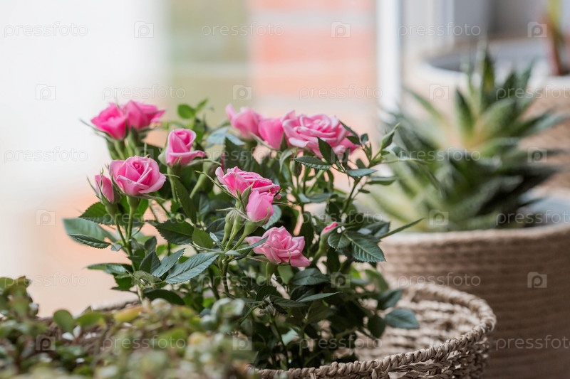 Уход за домашними растениями в домашних условиях. Домашние цветы. Розы на окне в стильных плетеных корзинах. Выращивание растений