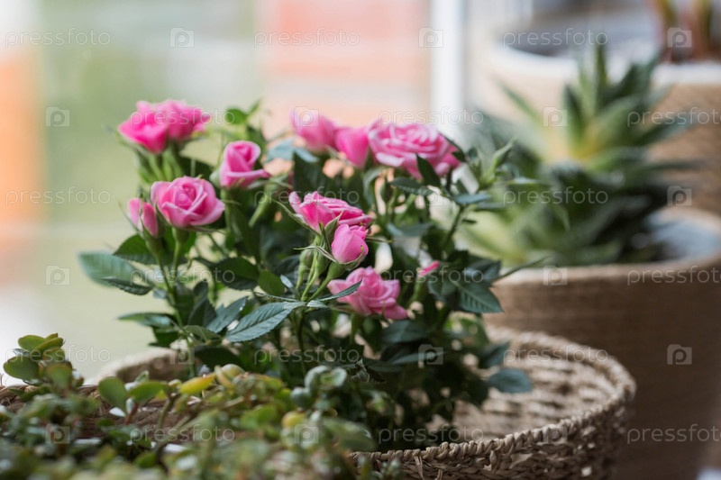 Уход за домашними растениями в домашних условиях. Домашние цветы. Розы на окне в стильных плетеных корзинах. Выращивание растений