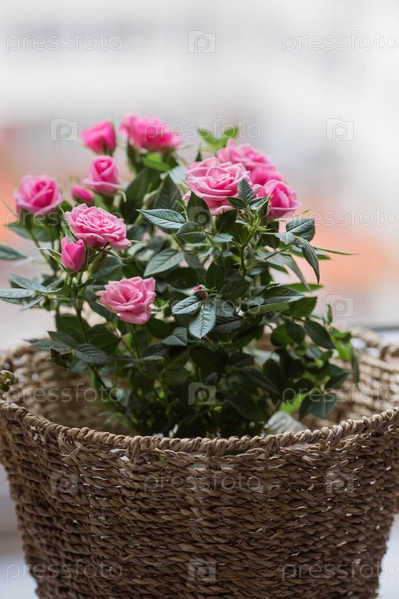Уход за домашними растениями в домашних условиях. Домашние цветы. Розы на окне в стильных плетеных корзинах. Выращивание растений