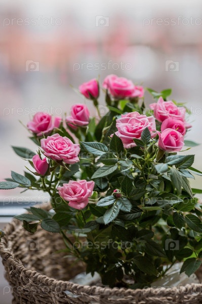 Уход за домашними растениями в домашних условиях. Домашние цветы. Розы на окне в стильных плетеных корзинах. Выращивание растений
