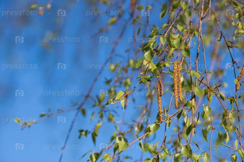 Березовые ветки с сережками и молодыми листьями весной в качестве фона или места для копирования текста. Березовый цвет. Аллергия