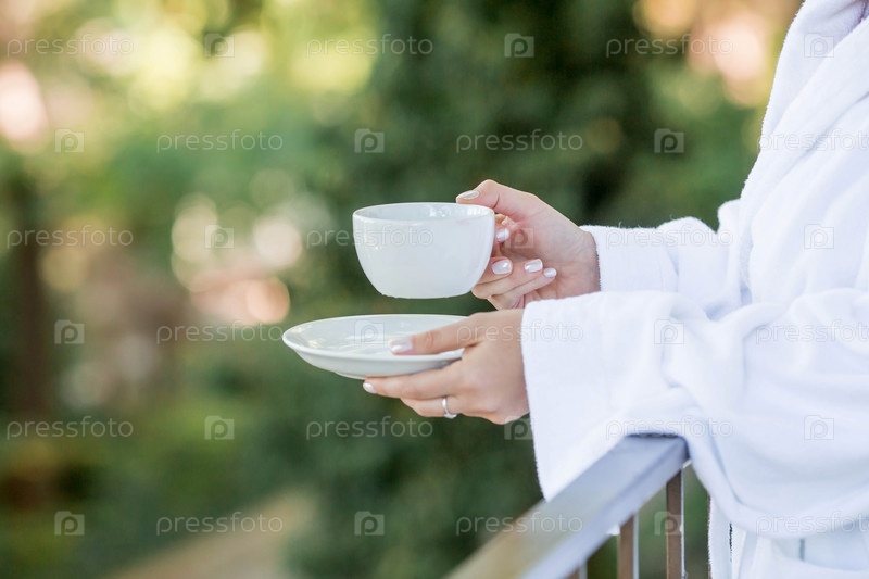 Чашка горячего чая в руках девушки в белом халате. Утро невесты. Концепция пребывания в отеле и начало свадебного дня