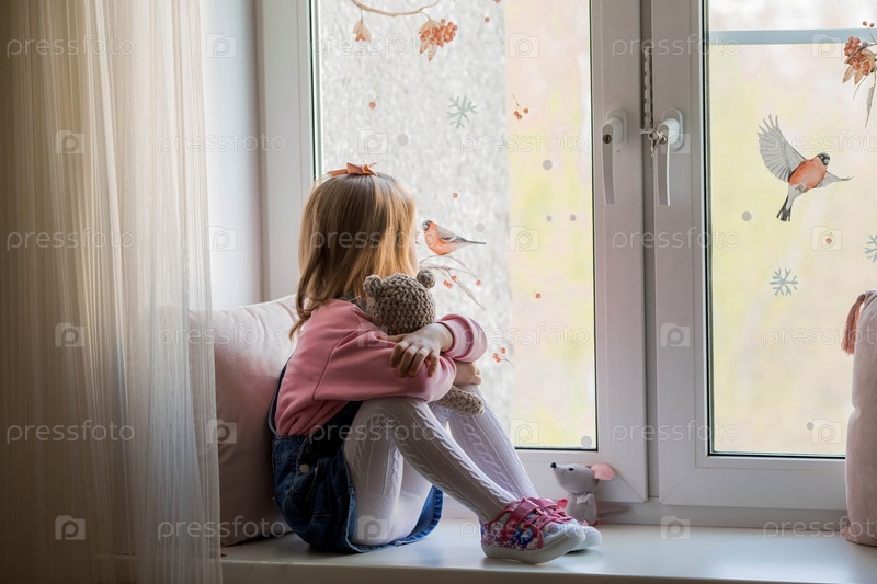Семья, детство и любовь. Портрет красивой маленькой девочки, сидящей на подоконнике. У окна играет ребенок с плюшевым мишкой в руках. Детство и опасность