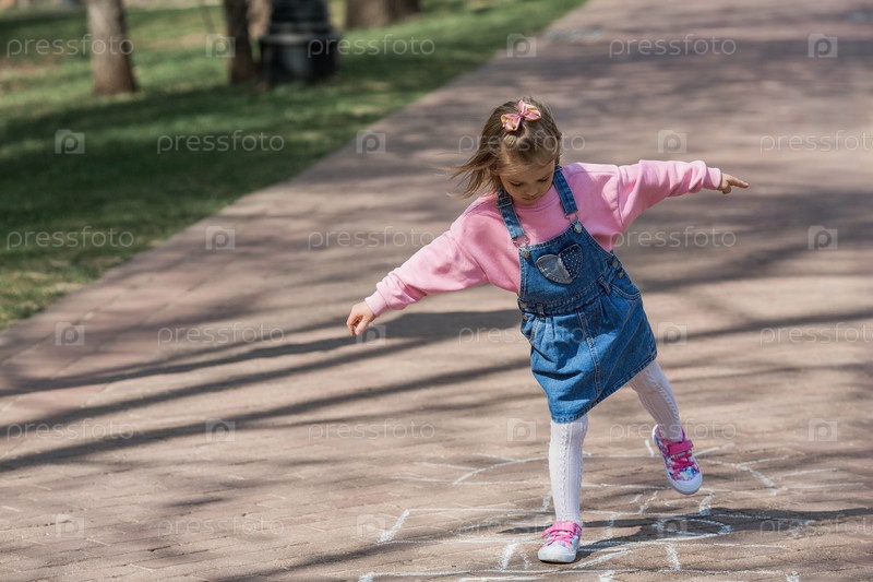 Счастливая девушка в розовой одежде рисует классику мелом на асфальте на улице. Портрет маленькой девочки, играющей и прыгающей в классики в солнечный летний день. Творческое развитие детей