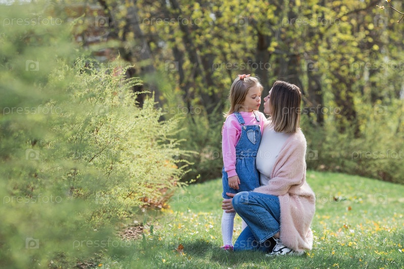 Красивая маленькая девочка в розовой одежде гуляет со своей мамой в парке на свежем воздухе. Семья, дети, материнство